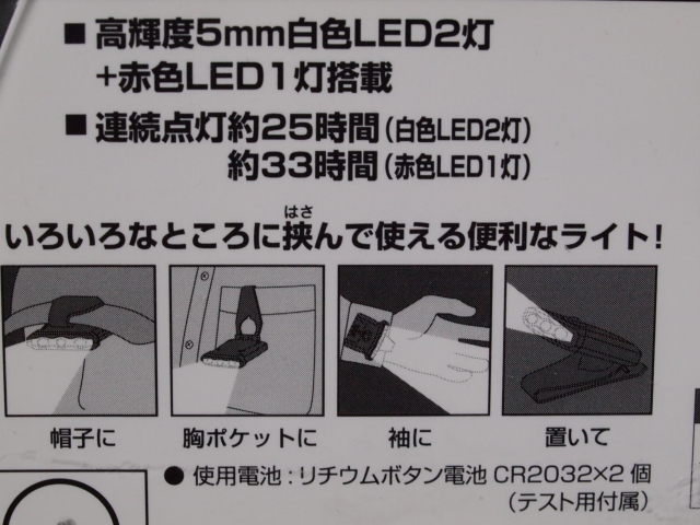 いろんな所に挟んで使えます。連続点灯約25時間(白)です。リチウムイオン電池CR2032×2