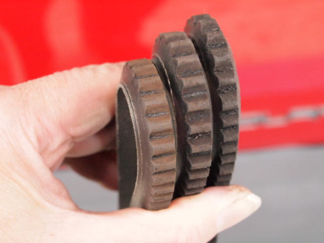 車上目視で見てもさほど異常はありませんが外して見ると一目瞭然です。ベルトが切れてJAFを呼ぶ前に早めのファンベルト交換で安心してドライブして下さい。