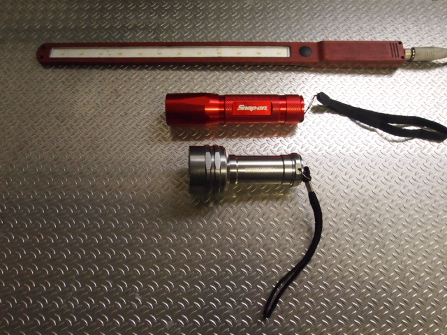 LED高性能ハンディーライト比較 2014年2月4日2017年4月4日 garecra カーライフ 本日は時間あるのでLEDの話をします。仕事でよく使う3タイプです。一番上はスキニーライトです。特徴は薄型で丈夫です。タイヤで踏んでも壊れないですよ。(トラックは無理かも)薄いのでエンジンルームで使い勝手良いです!2番目はスナップオンのハンディーです。1LEDですがレフ板で集光しますので明るいです。ポケットに入れやすいです!3番目はアストロプロダクツの物です。LEDの数28個で満足です。